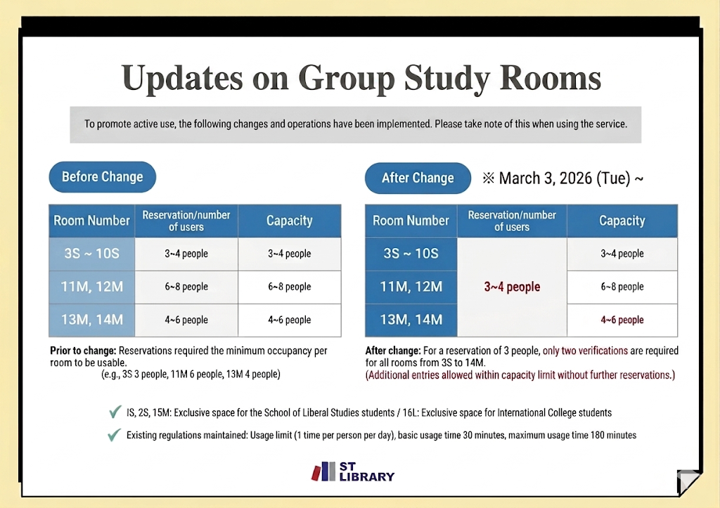 On February 24, 2026, announcement about updates to the operation of the Group Study Rooms in the Annex Library was posted on the SeoulTech Library website. The adjustments are mainly about regulations regarding the minimum number of people for reservations and the authentication process for using the Group Study Rooms. The updated guidelines went into effect on March 3, 2026.
