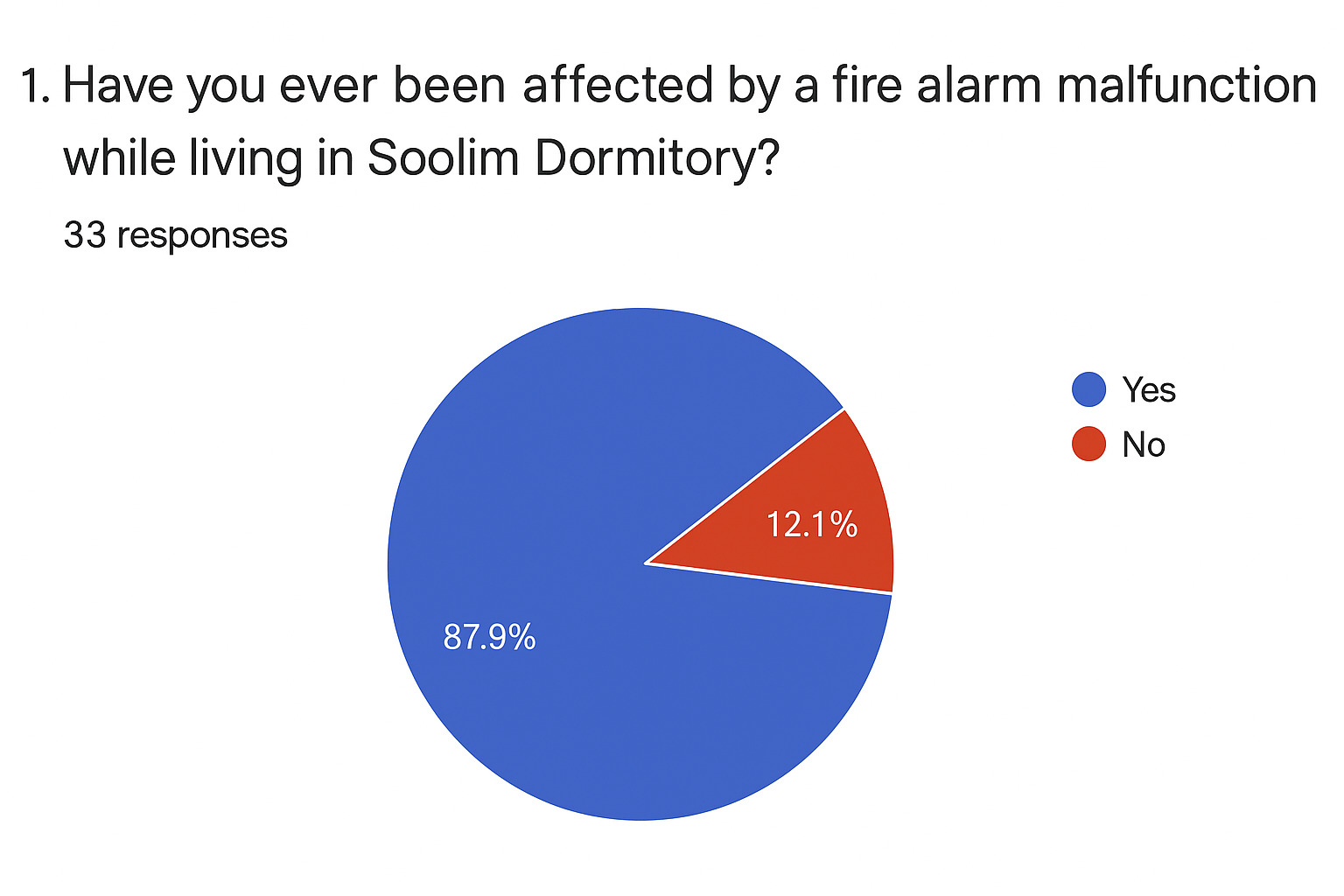 Frequent fire alarm malfunctions have recently become an issue at the Soolim Dormitory. In response to the question, “Have you ever been affected by a fire alarm malfunction while living here?” the majority of residents answered “Yes.”