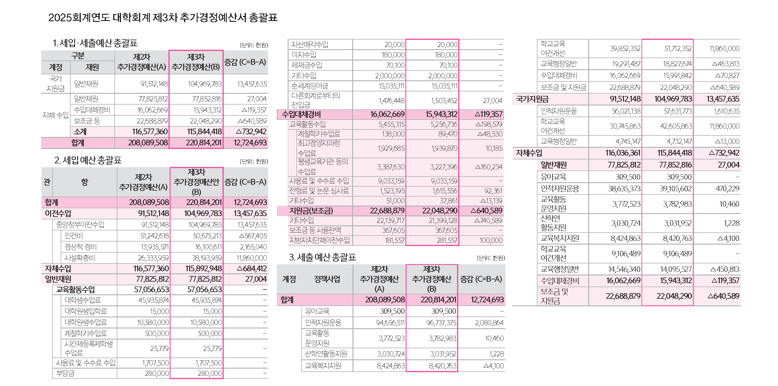 2025회계연도 대학회계 제3차 추가경정예산서 총괄표2026.03.08 711호