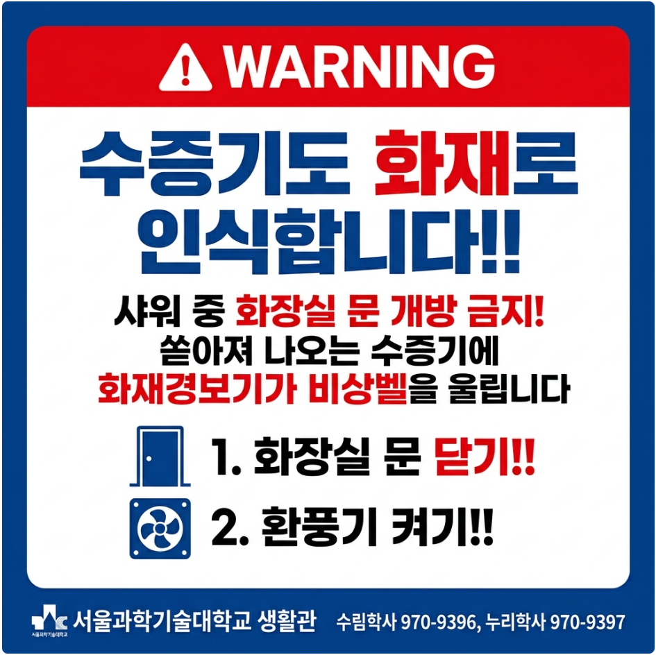 이에 김동현 생활관 행정지원팀장은 “화재경보기는 연기뿐 아니라 수증기나 먼지에도 반응할 수 있다”며 “특히 누리학사와 수림학사에 설치된 일부 감지기가 욕실 인근에 있어, 샤워 시 발생하는 수증기를 연기로 인식하는 경우가 있다”고 설명했다. 이어 “여러 호실에서 동시에 온수를 사용할 때 수증기가 축적되며 경보가 울릴 가능성이 크다”고 덧붙였다.