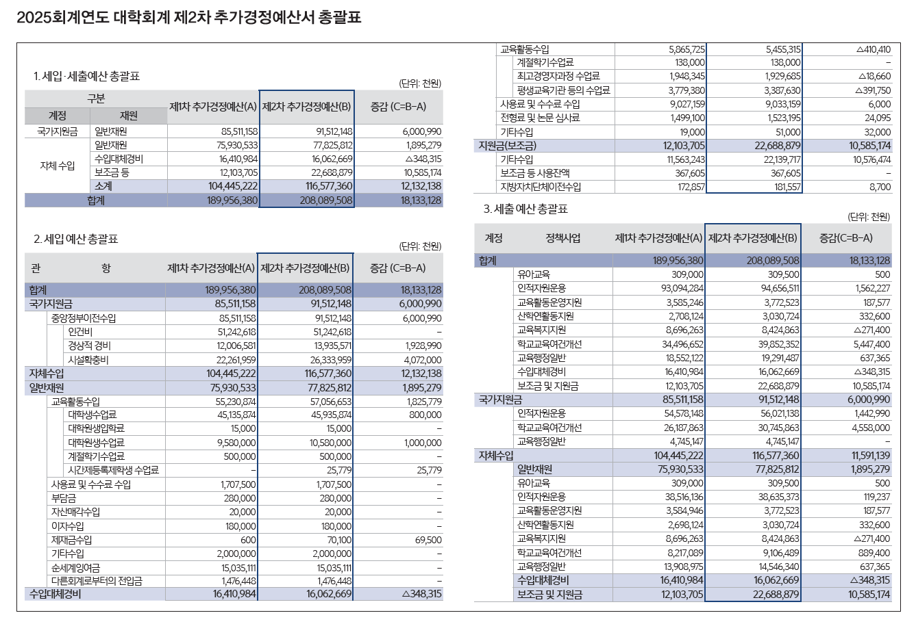 2025회계연도 대학회계 제2차 추가경정예산서 총괄표