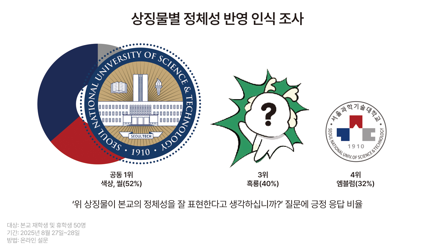 주요 원인은 잦은 교명 변경이 지목된다. 우리대학은 1910년 보습학교로 출발해 공업학교, 산업대학을 거쳐 일반대학에 이르기까지 여러번 교명을 바꿨다. 현 교명 ‘서울과학기술대학교’도 2010년부터 사용돼 대중적 인식이 자리 잡기에는 시간이 충분하지 않았다. 대학 정체성이 일관되게 이어지지 못하고 상징체계도 자주 바뀌다 보니, 상징물이 꾸준히 각인될 기회를 충분히 확보하지 못한 것이다. 정체성 변화의 역사가 길었던 만큼, 상징물 인지도 확산에는 보다 전략적이고 장기적인 노력이 필요하다는 의견이 제기된다.
