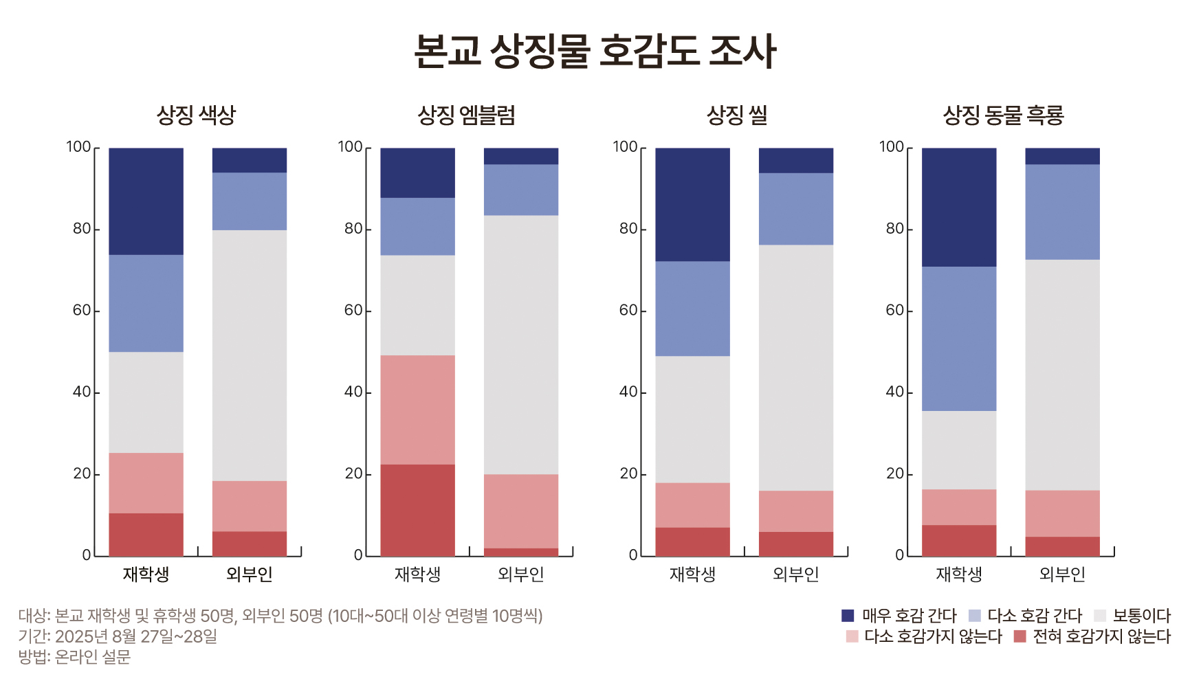 학우들은 상징물에 어느 정도 호감을 보였다. 50명을 대상으로 한 조사에서 ‘호감이 간다’(매우 호감+다소 호감)는 응답은 ▲흑룡(62%) ▲씰(58%) ▲색상(52%) ▲엠블럼(24%) 순이었다. ‘호감이 가지 않는다’(다소 호감 가지 않는다+전혀 호감 가지 않는다)는 대부분 20% 안팎이었으나, 엠블럼만 절반에 달하는 48%가 비호감을 표시했다. 외부인은 네 가지 상징물 모두에서 60% 안팎으로 ‘보통이다’라고 답해 전반적으로 중립적인 태도를 보였으며, 긍정응답의 비율이 부정응답보다 다소 높았다.