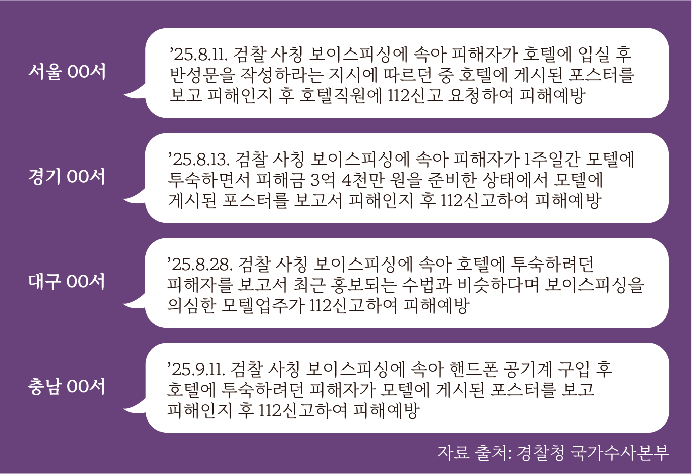 피해자가 기관사칭형 보이스피싱임을 확인하고 피해를 예방할 방법을 묻자 D씨는 “만약 피해자의 휴대전화에 해킹 애플리케이션이나 프로그램이 설치된 경우에는 112나 금융기관으로 전화를 걸어도 보이스피싱 조직 콜센터로 연결돼 더 큰 피해로 이어진다”며 “조금이라도 보이스피싱이 의심된다면 주변에 도움을 요청해 해킹 애플리케이션 등이 설치되지 않은 다른 휴대전화로 수사기관에 확인 전화를 하거나 직접 경찰서 또는 금융기관을 방문해 도움을 요청해야 한다”고 강조했다.