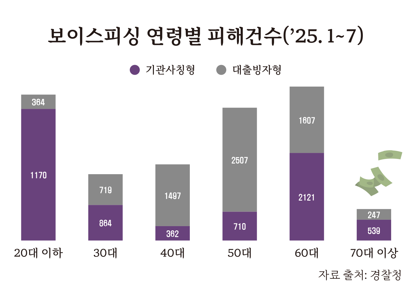 피해 규모의 확대와 함께 두드러지는 것은 청년 피해자의 증가다. 경찰청 국가수사본부가 제공한 ‘보이스피싱 피해자 연령대별 현황’에 따르면 기관사칭형 보이스피싱의 2~30대 청년층 피해 비율이 전체의 절반을 넘는 52%를 기록했다. 20대 이하 피해자의 24년 상반기 대비 25년 상반기 증가율은 15.6%, 30대 피해자의 증가율은 무려 93.3%로 청년들이 보이스피싱 피해에서 결코 안전하지 않음을 보여준다.