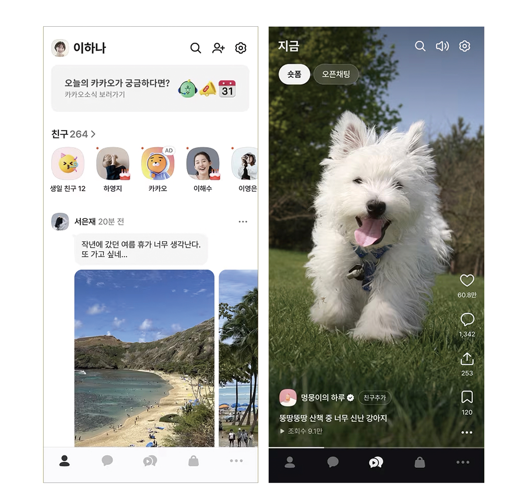 카카오는 지난 9월 23일(화) ‘이프(if) 카카오’ 행사에서 카카오톡을 SNS형 플랫폼으로 전환하는 업데이트를 발표했다. 친구 목록은 ‘친구 탭’으로 전환해 프로필 사진과 게시물을 목록형에서 격자형 피드로 변경하고, 하단에는 숏폼 콘텐츠를 제공하는 ‘지금’ 탭을 신설했다. 이 외에도 ▲채팅방 폴더 ▲읽지 않은 채팅 모아보기 ▲24시간 내 메시지 수정 ▲보이스톡 통화 녹음 및 요약 등 메신저 기능을 강화했다. 올해 안으로는 ▲챗GPT 연동 ▲AI 비서 카나나(숏폼 콘텐츠 생성, 통화 내용 요약, 일정 관리, 검색) 기능을 도입할 예정이다.