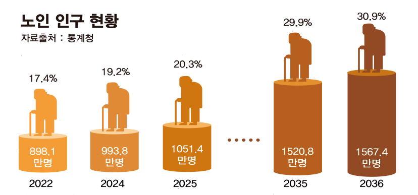 대한민국의 노인인구 통계 수치 중 놀라운 것은 증가 속도이다. 행정안전부 주민등록 인구통계에 따르면 2013년 65세 이상 비율은 11.7%에 불과했지만, 11년 만에 19%대로 급증했다. 초고령사회란 65세 이상 노인의 비율이 20%가 넘는 사회를 뜻하는데, 그 문턱에 바짝 다가간 것이다.