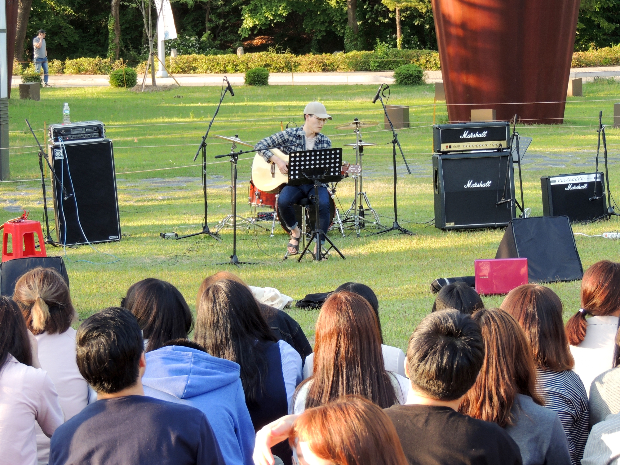 ▲ 17일(수)에 열린 '확성기-청춘을 말하다'에서 우리대학 영어영문학과 밴드동아리 프로토가 연주하고 있다.