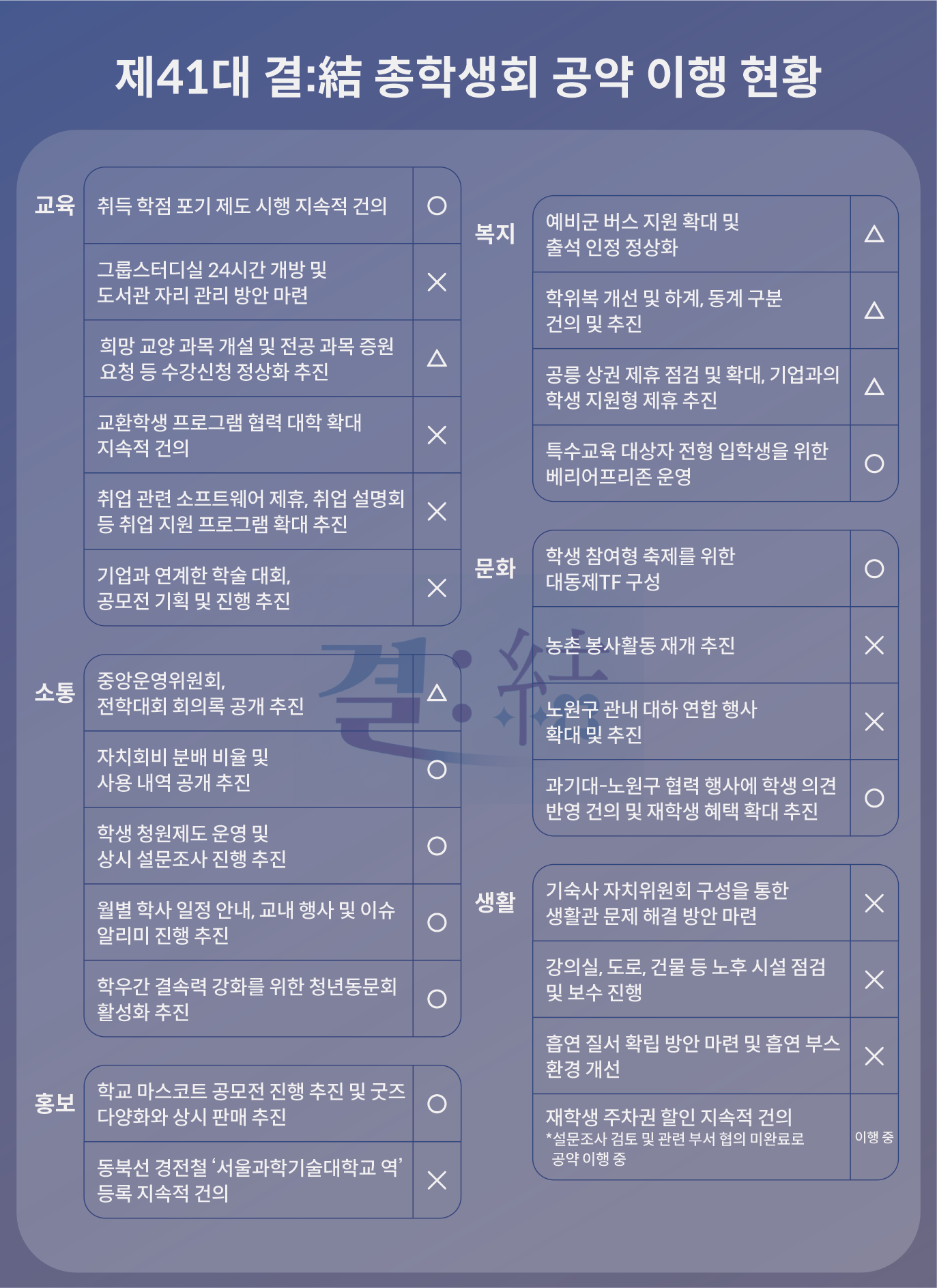 제41대 총학생회 결:結의 임기가 막바지에 이르렀다. 결:結 총학생회는 작년 말 출범 당시 교육·소통·복지·문화·생활·홍보 6개 분야에서 총 25개의 공약을 제시했다. 올해 공약 추진 결과는 ▲이행 9개(36%) ▲일부 이행 5개(20%) ▲미이행 10개(40%) ▲이행 중 1개(4%)로 전체 공약 달성률 약 56%에 달한다.