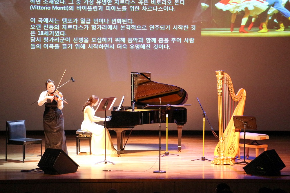 ▲ 3일(월)에 열린 월요음악공감 음악회에서 바이올리니스트 이정화(좌) 씨, 피아니스트 이선아(우) 씨가 연주하고 있다.