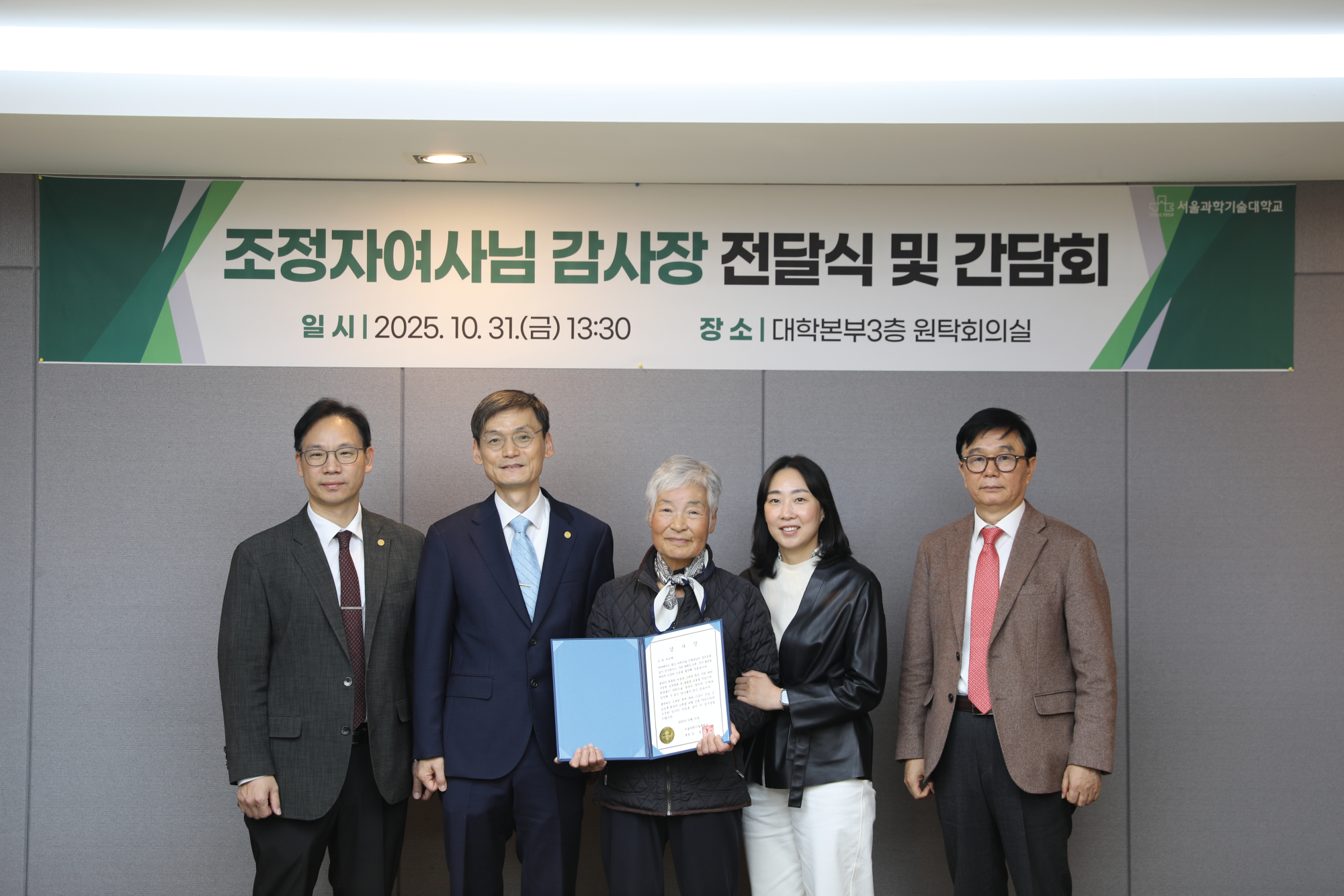 ▲(왼쪽부터) 황일남 비서실 주무관, 김동환 총장, 조정자 여사, 추선경 전문실습관, 신윤호 대외협력처장